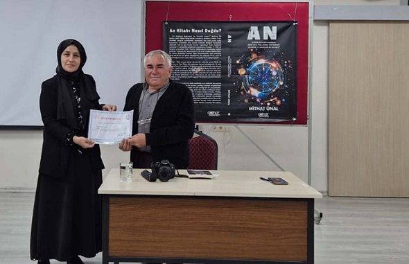 Gazeteci Mithat Ünal fotoğraf çekiminden yola çıkarak maddenin evrendeki anlık mekan değişimini sorgulayan AN kitabını Anamur Şehit Yüksel Alçın Anadolu İmamhatip Lisesi öğrencilerine imzaladı.